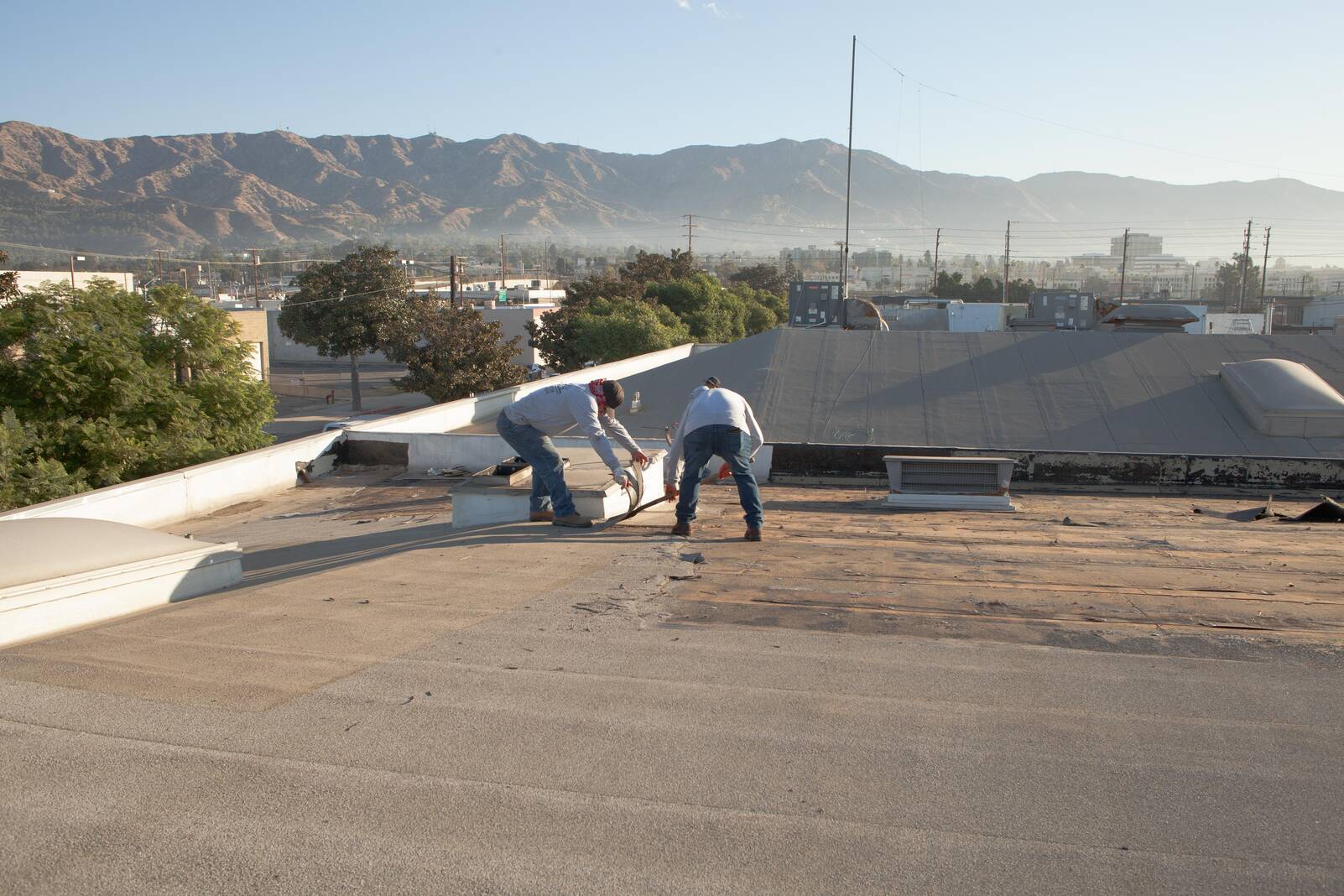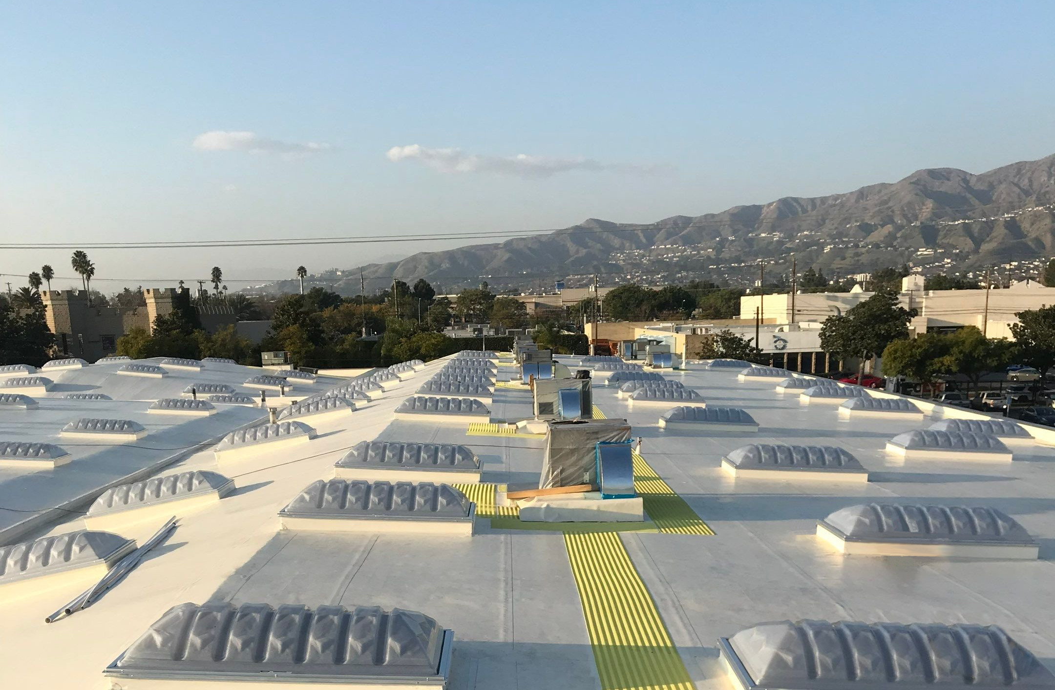 Gil's Roofing (JLG Roofing) offers re-roofing services including conversion to single-ply for large commercial buildings. Photos shown below are from a completed project in Burbank, CA on a 75,000 sq ft building.